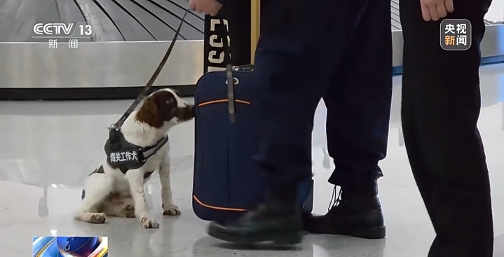 “全全”和驯导员走在人流间,旅客拉着行李箱在他们身旁走过,空气中混杂着衣服、化妆品等各种物品的气味。“全全”努力的嗅探着,肉类、水果、奶制品等多种违禁品都是它的搜寻目标,但每件行李留给它的时间只有几秒钟。忽然,“全全”在一位旅客的行李箱旁坐定,并示意驯导员。