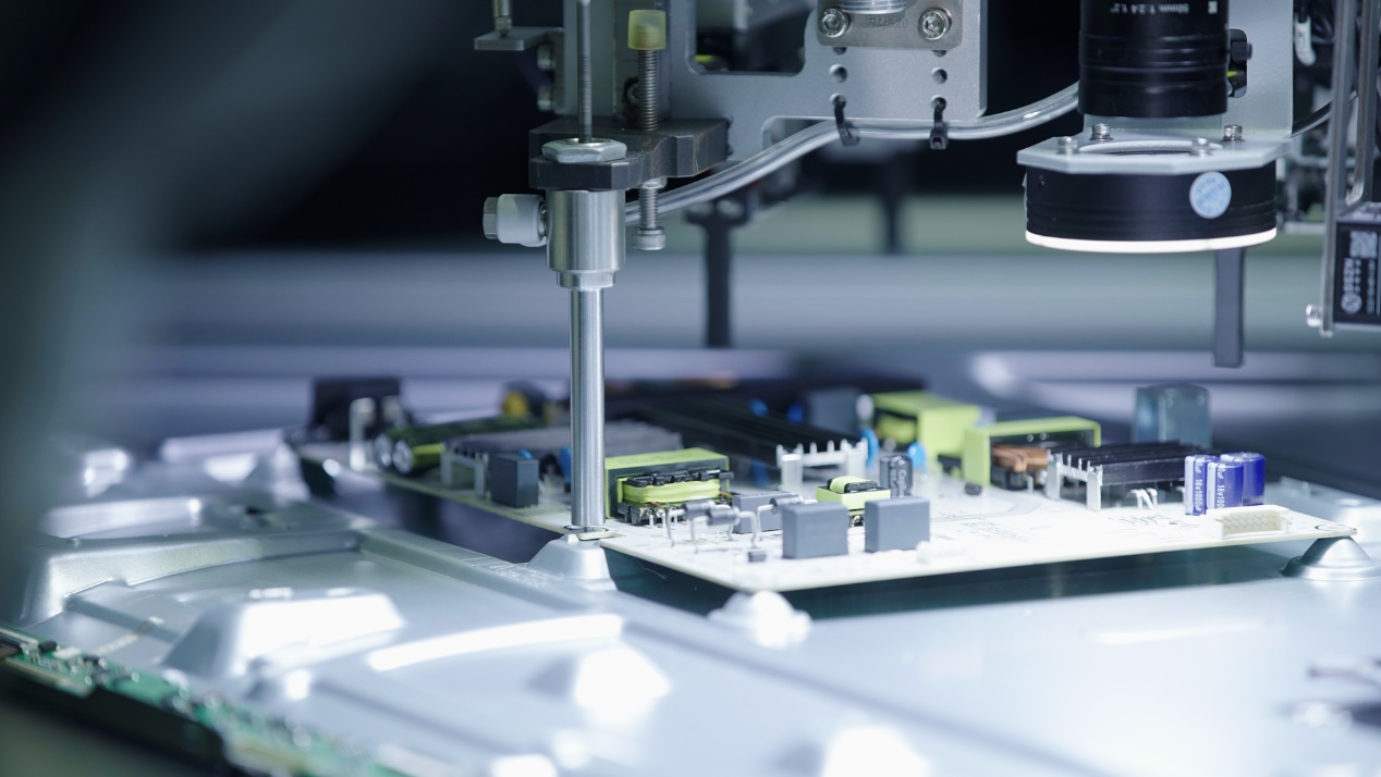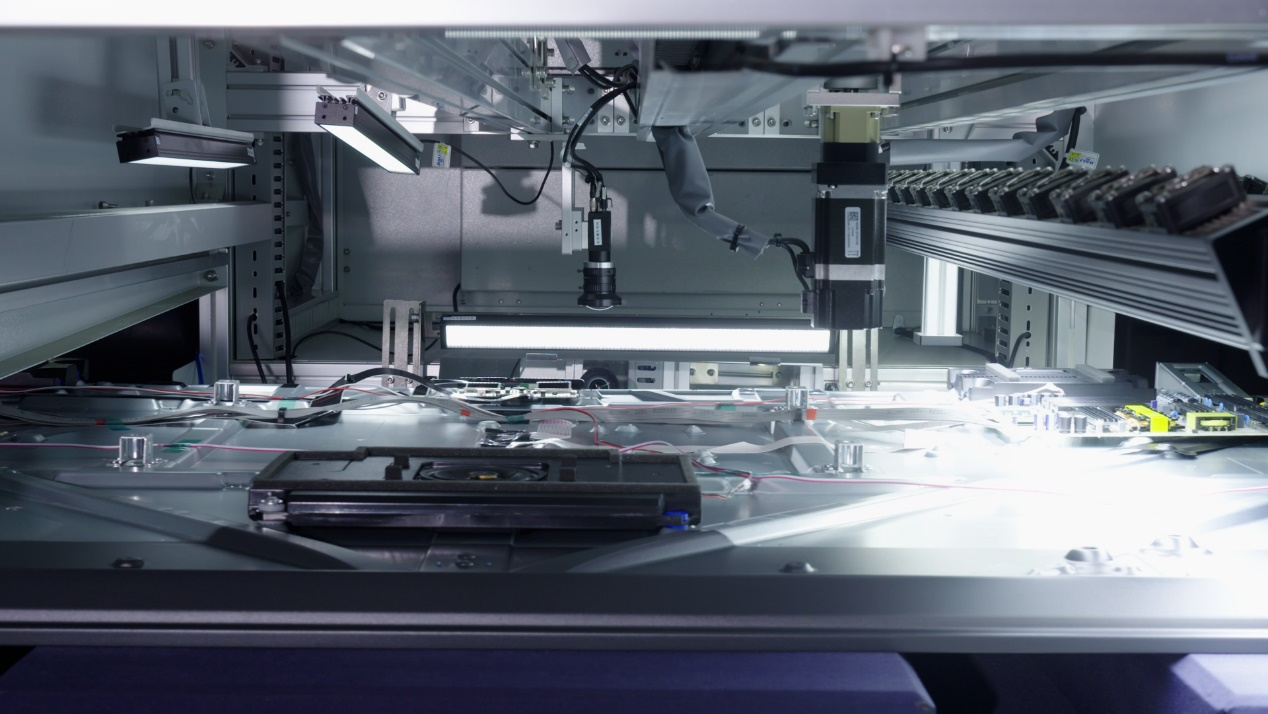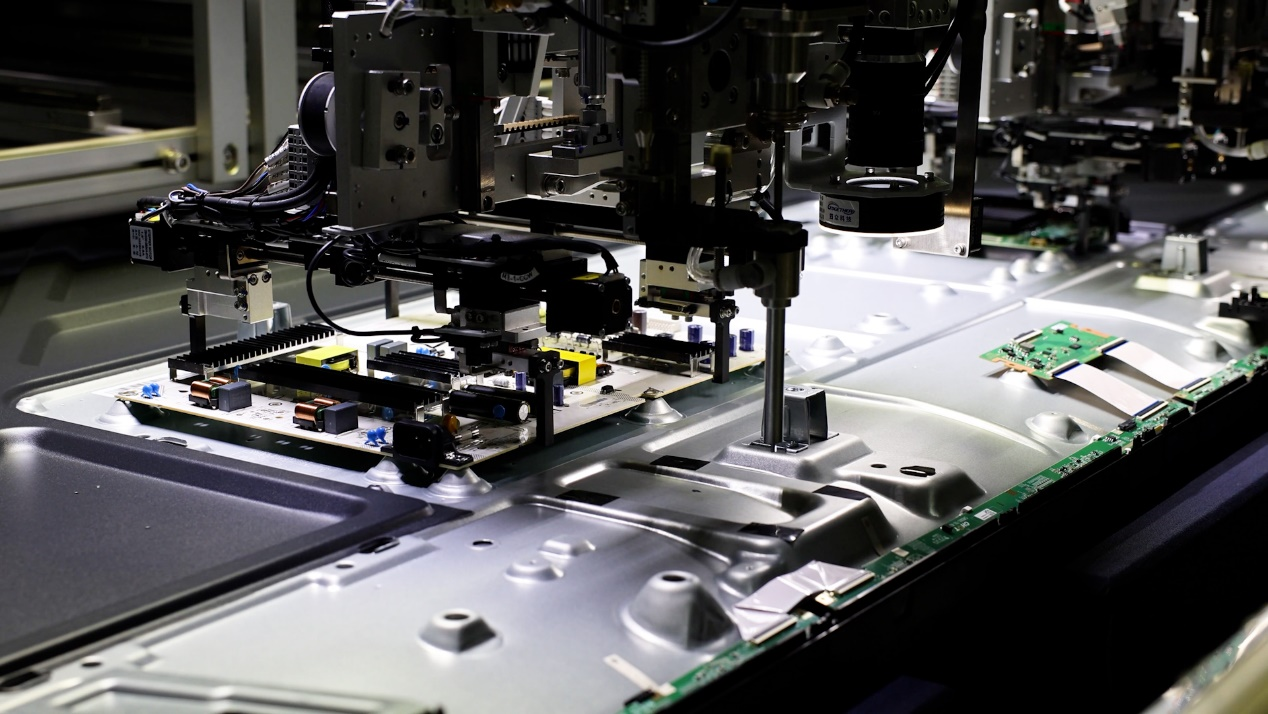 生产制造环节,工厂搭建了行业领先的第三代数字化高效电视生产线,集成25项自研首台套自动化设备,其中11项为业内首创。针对85英寸大屏面板装配难题,采用行业首创的矩阵式面板精确卡合方案,通过多组高精度视觉相机与AI算法配合,实现自动撕膜、精准装配和实时校准的全流程自动化,定位精度达0.1毫米级,替代了传统5名工人的手动操作。