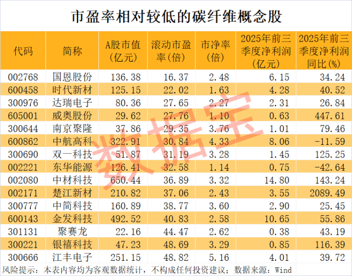 据证券时报·数据宝统计,截至12月26日收盘,碳纤维概念股12月以来平均上涨12.58%。10只概念股累计涨幅逾20%,包括神剑股份、光大同创、博云新材、中复神鹰、华伍股份等。估值水平方面,截至12月26日收盘,滚动市盈率低于40倍的碳纤维概念股有11只,包括国恩股份、时代新材、达瑞电子、威奥股份、南京聚隆等。