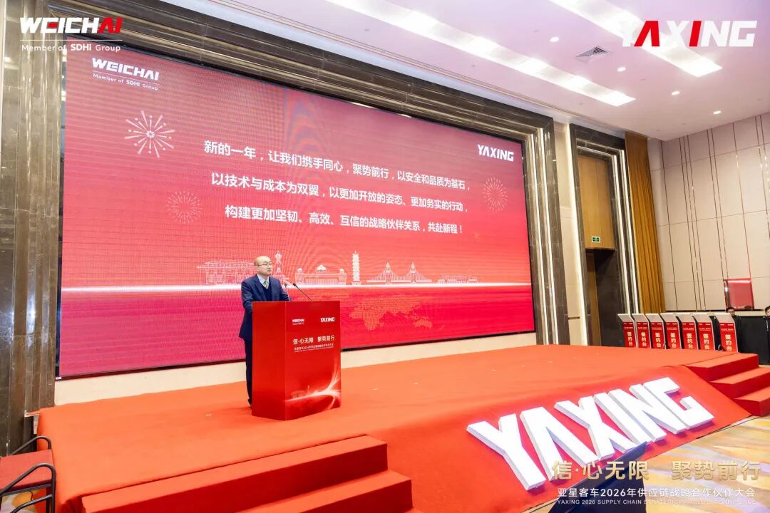 张锡强在致辞中指出,2026年,亚星客车将聚焦四大方向:一是强产品,持续创新、质量领先,打造核心竞争力产品矩阵;二是拓市场,海内外双轮驱动,扩大全球品牌影响力;三是降成本,全价值链协同优化,提升成本竞争力;四是保增长,全面提升运营效率与质量,保障企业健康发展。他表示,2026年亚星客车将以自信筑基、以诚信立本、以恒信致远,与广大合作伙伴构建“命运相连、生态共荣”的供应链生态共同体。