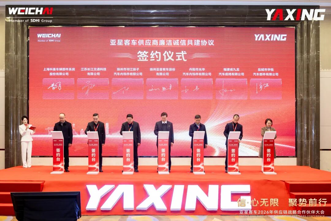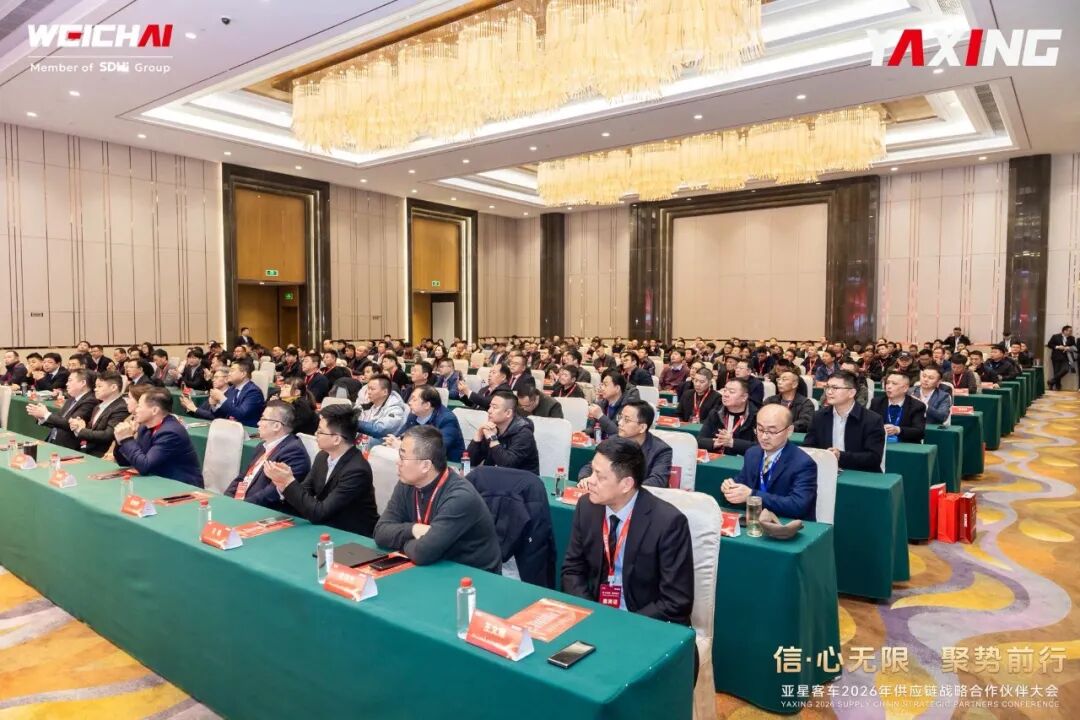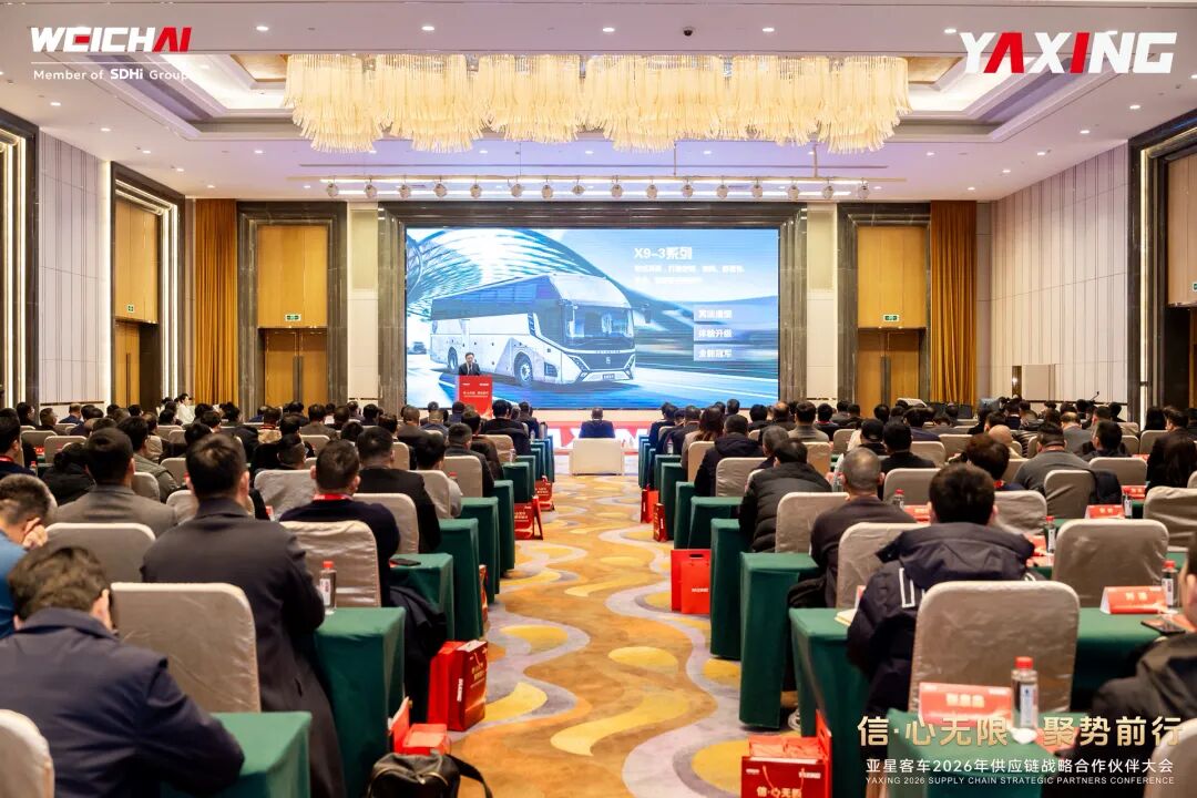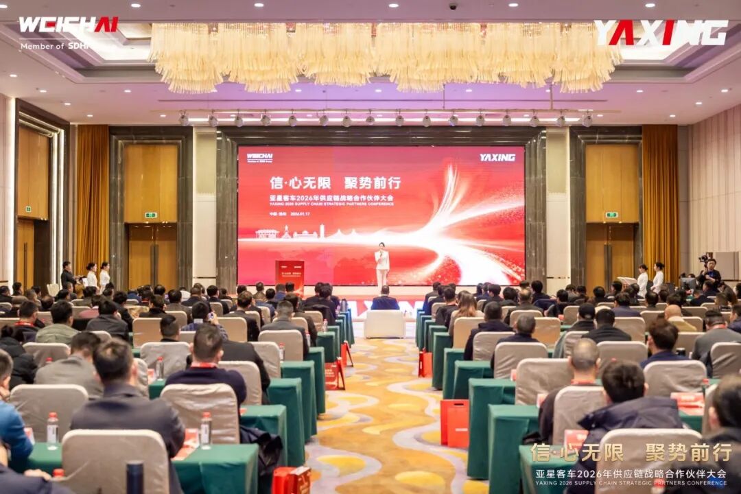 1月17日,“信.心无限聚势前行”亚星客车2026年供应链战略合作伙伴大会在扬州隆重召开。潍柴集团副总经理、亚星客车党委书记、董事长王延磊,亚星客车党委副书记、总经理张锡强出席大会并发表讲话。来自全国各地的核心供应商代表齐聚一堂,共叙合作、共谋发展、共启新程。